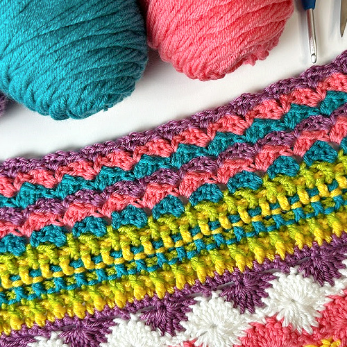 The Tulip Stitch creates a repeating pattern of slanted shells that resemble little blooming flowers lined up across your blanket. It has a beautiful flow to it and adds a softer, decorative texture compared to some of the more structured stitches we’ve used so far.