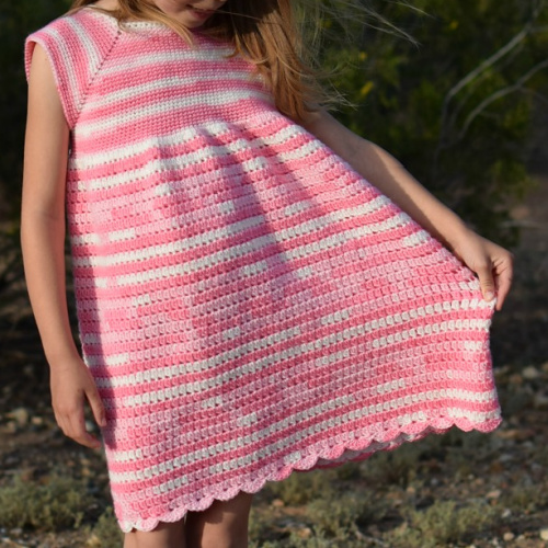 This dress is designed to be comfortable, playful, and beginner-friendly, with just enough texture in the skirt to make it feel extra special. The yarn choice gives it a soft feel with beautiful color changes, so the pattern looks impressive without needing complicated stitchwork.