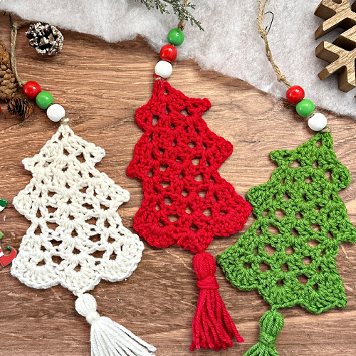 This Christmas Tree Ornament crochet pattern is worked flat with simple stitches, then shaped into a modern, minimalist tree silhouette. A tassel is added to the bottom for extra style, and beads at the top create a polished and festive finishing touch.