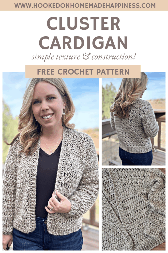 The Cluster Cardigan Crochet Pattern is a cozy, textured layering piece thatโs fun to make and even more fun to wear! This cardigan is worked as a flat panel, with simple seaming at the shoulders. The sleeves are then added in rounds, making it a straightforward and beginner-friendly garment construction.