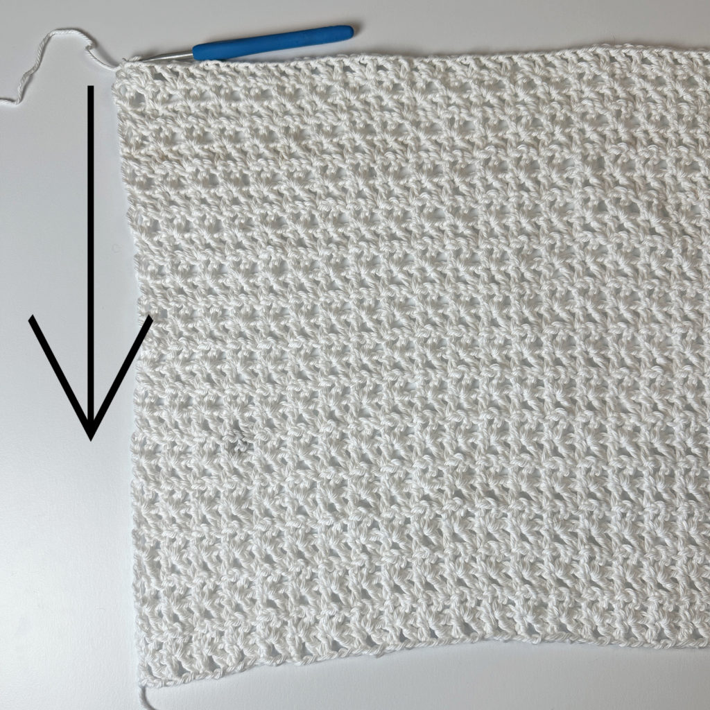 Row 1: ch 1, turn, work along the short side of the rectangle, placing 2 sc in the end of each row (56 sc)