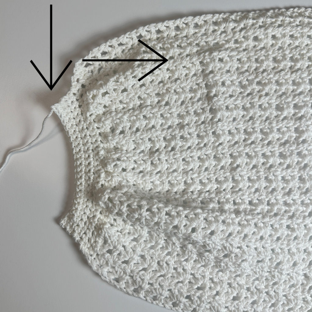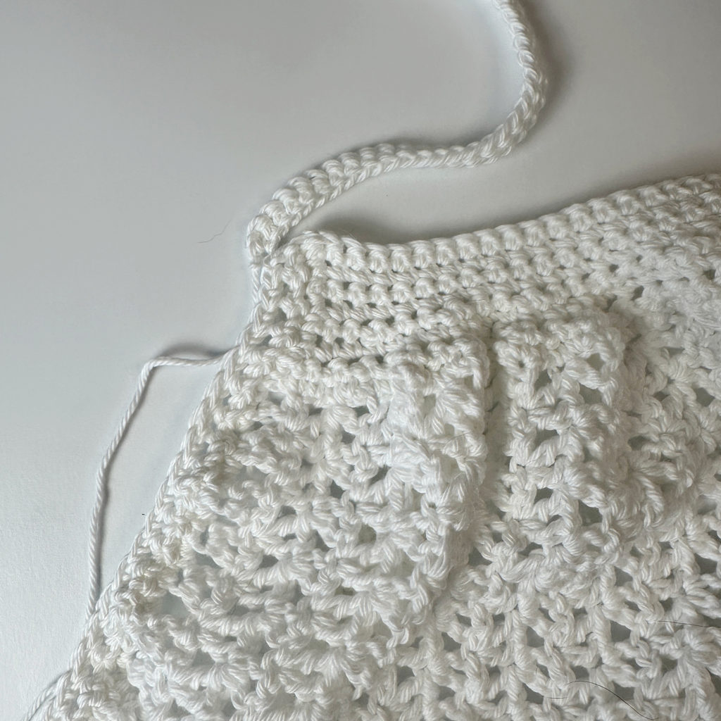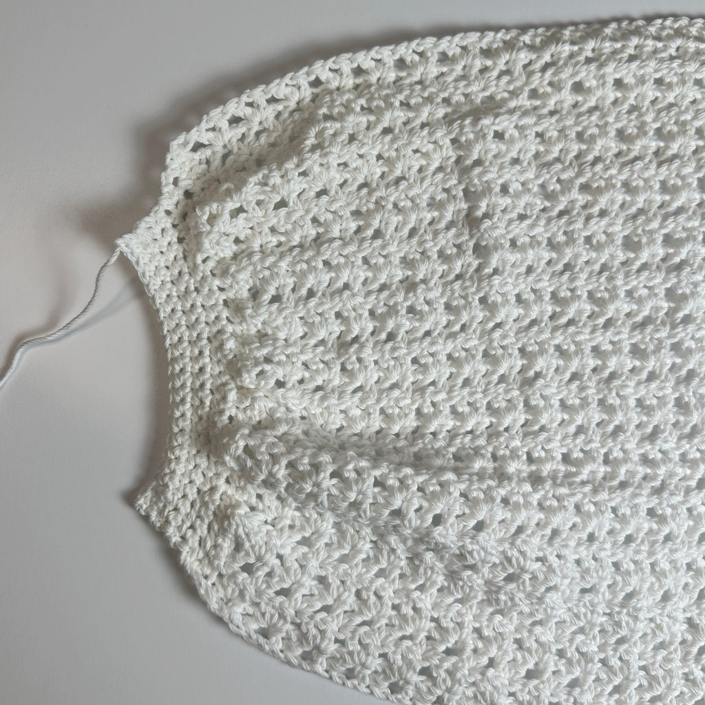 As you continue working, decreases along the sides gently taper the fabric inward, forming the classic market bag shape. The offset V stitch gives the bag its airy, lacy look while still maintaining structure—perfect for holding your essentials without stretching out too much.