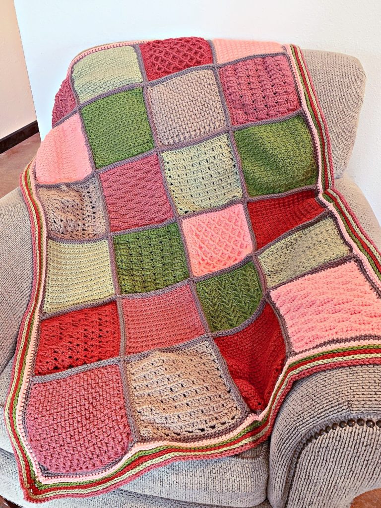 This blanket is made up of 24 squares featuring 12 different crochet stitches—each stitch is used twice to create a beautifully textured, cohesive design. It’s the perfect mix of learning, creativity, and cozy comfort.
