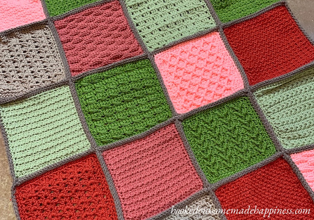 The Stitch Sampler Scrapghan is made in individual squares, then joined together to form the blanket.